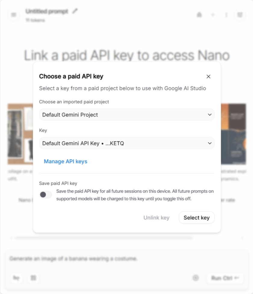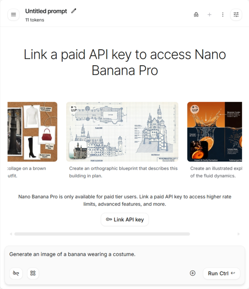 - Select Key를 눌러서 API Key를입력하고 Run Ctrl ↵를 클릭해 프롬프트를 전송합니다.