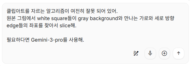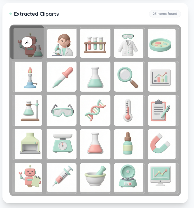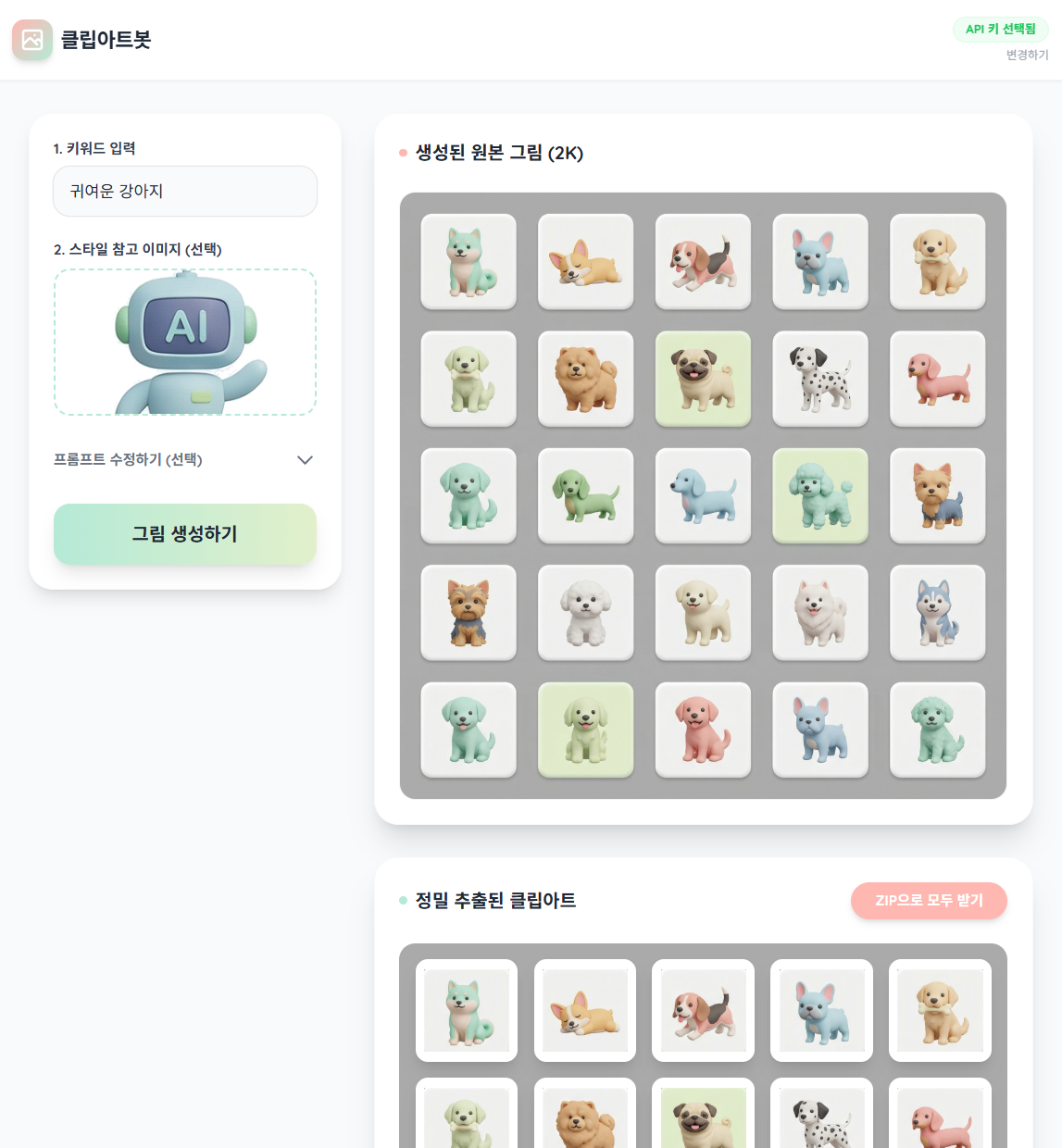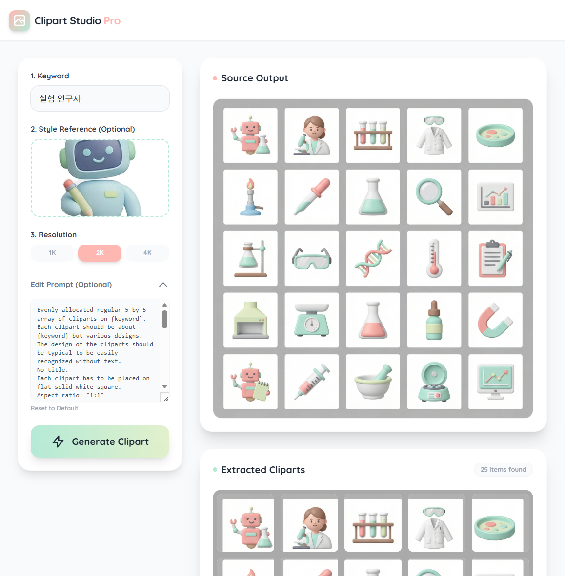 - 의도대로 키워드 넣고, 예제 이미지 넣고 (이것도 어제 나노바나나가 만든 겁니다), Generate Clipart를 누르면 Source Output에 생성 이미지가, Extrcted Clipart에 잘린 클립아트들이 나열됩니다.
